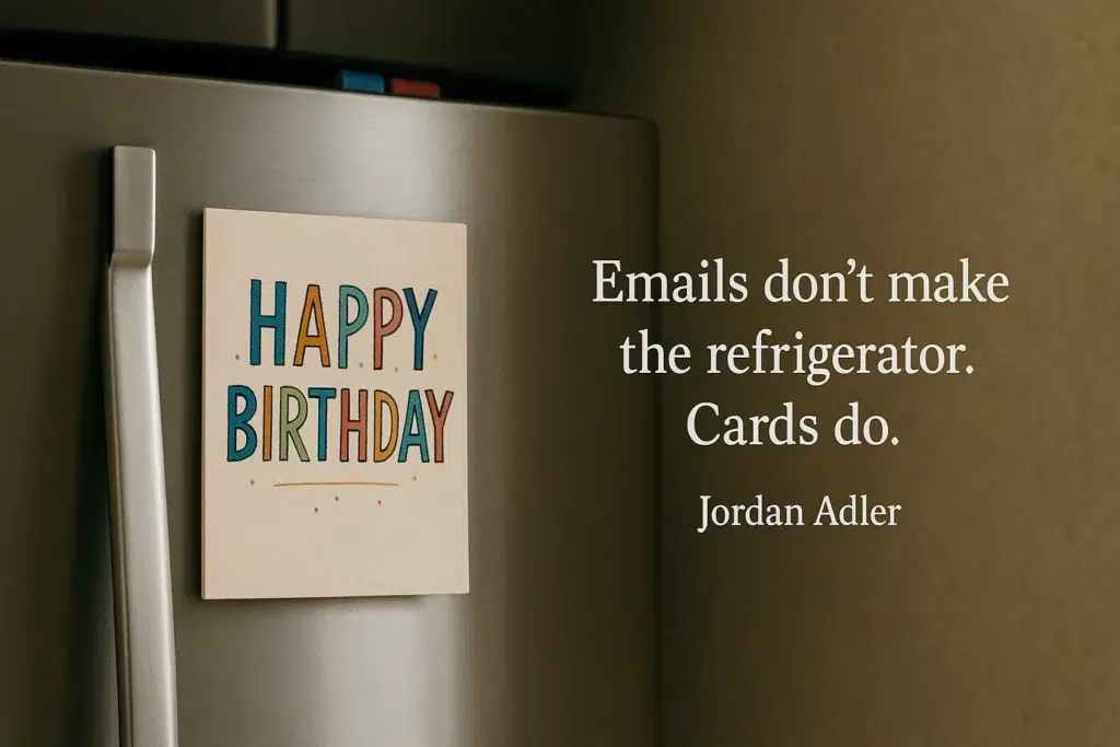 My advice? Never underestimate the power of a handwritten card. Emails get deleted. Cards go on the fridge.